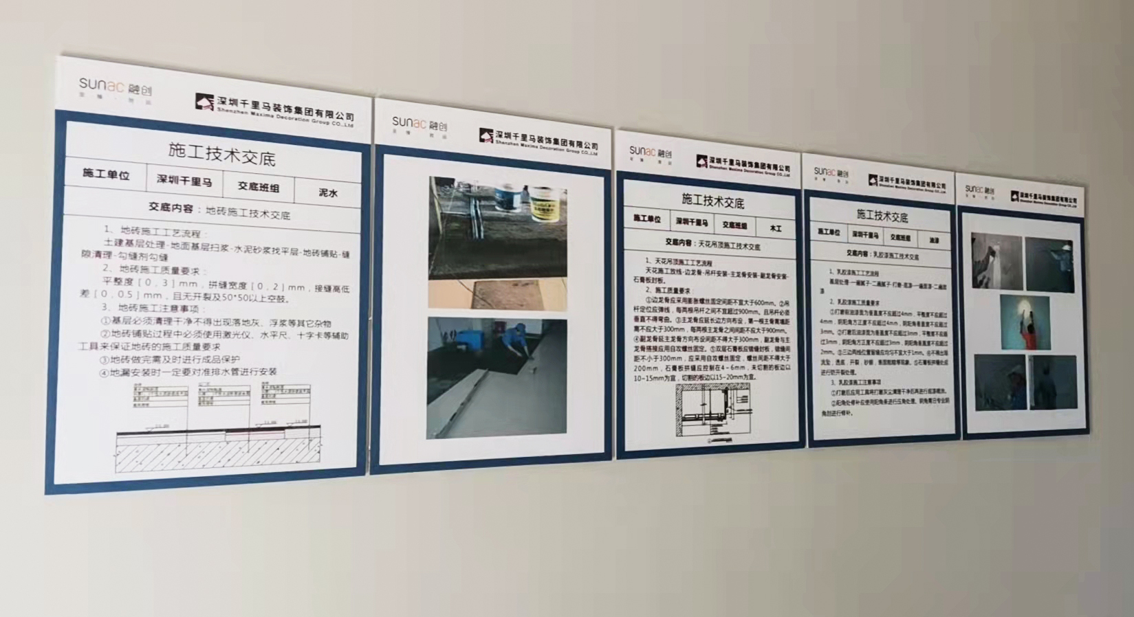優(yōu)異成績(jī)的取得,是千里馬裝飾積極發(fā)揮施工技術(shù)及項(xiàng)目管理上的優(yōu)勢(shì),有效應(yīng)用“樣板先行”、“技術(shù)交底”等新方法的充分體現(xiàn)。在項(xiàng)目施工前,就會(huì)由相關(guān)專業(yè)技術(shù)人員向參與施工的人員進(jìn)行設(shè)計(jì)、施工及專項(xiàng)技術(shù)交底,讓施工人員對(duì)工程特點(diǎn)、技術(shù)質(zhì)量要求、施工方法與措施和安全等方面有一個(gè)更全面詳細(xì)的了解,以便于科學(xué)地組織施工。