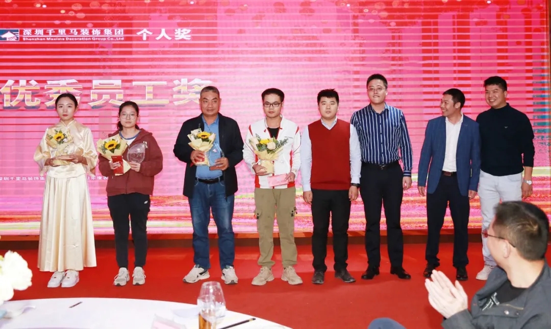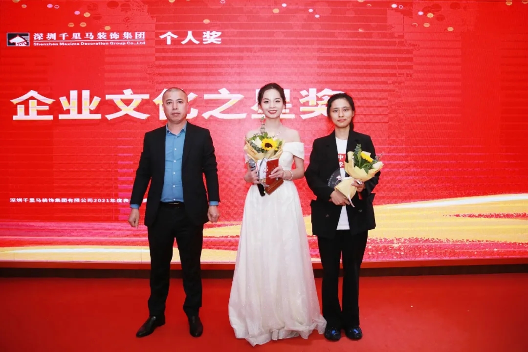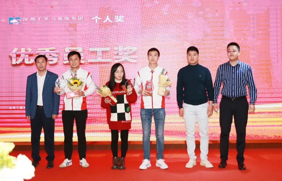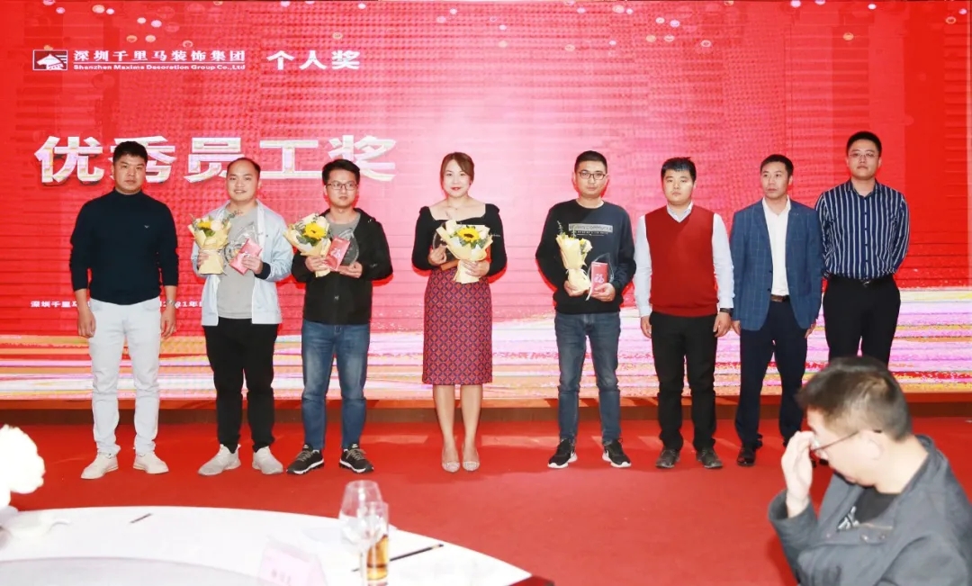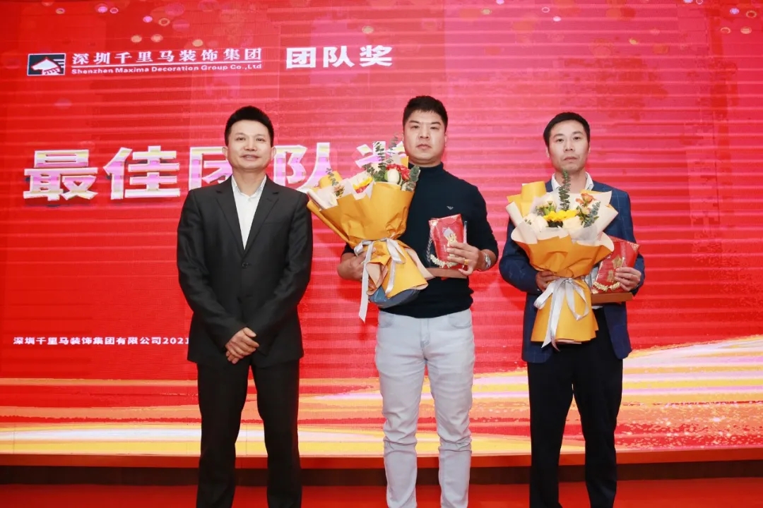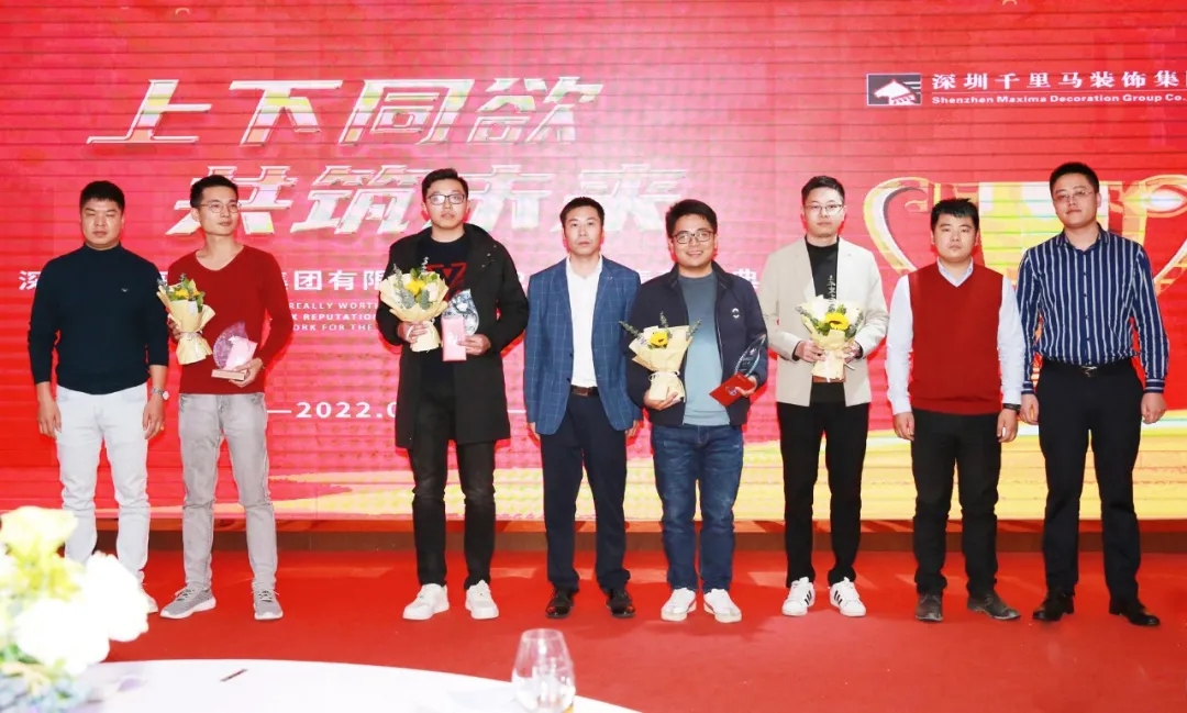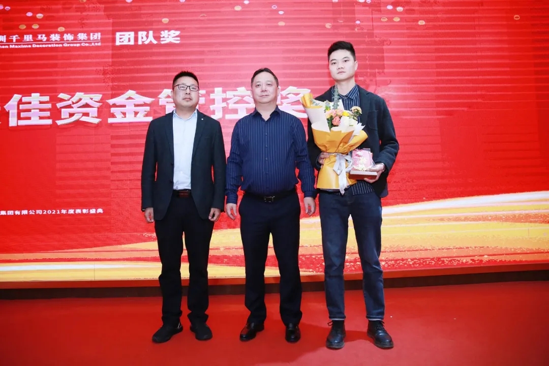隨后,千里馬裝飾李向東董事長、李文學總經理、朱建國副總經理、丁利斌副總經理等領導分別為2021年度優秀團隊及個人進行了表彰頒獎,這其中有公司的新人,也有見證公司歷程的元老,更有一批與公司長期同發展、共進步的項目管理人員,現場全體人員為他們獻上了最熱烈的掌聲,感謝他們為公司創造的卓越成績,鼓勵他們為公司做出更大貢獻。