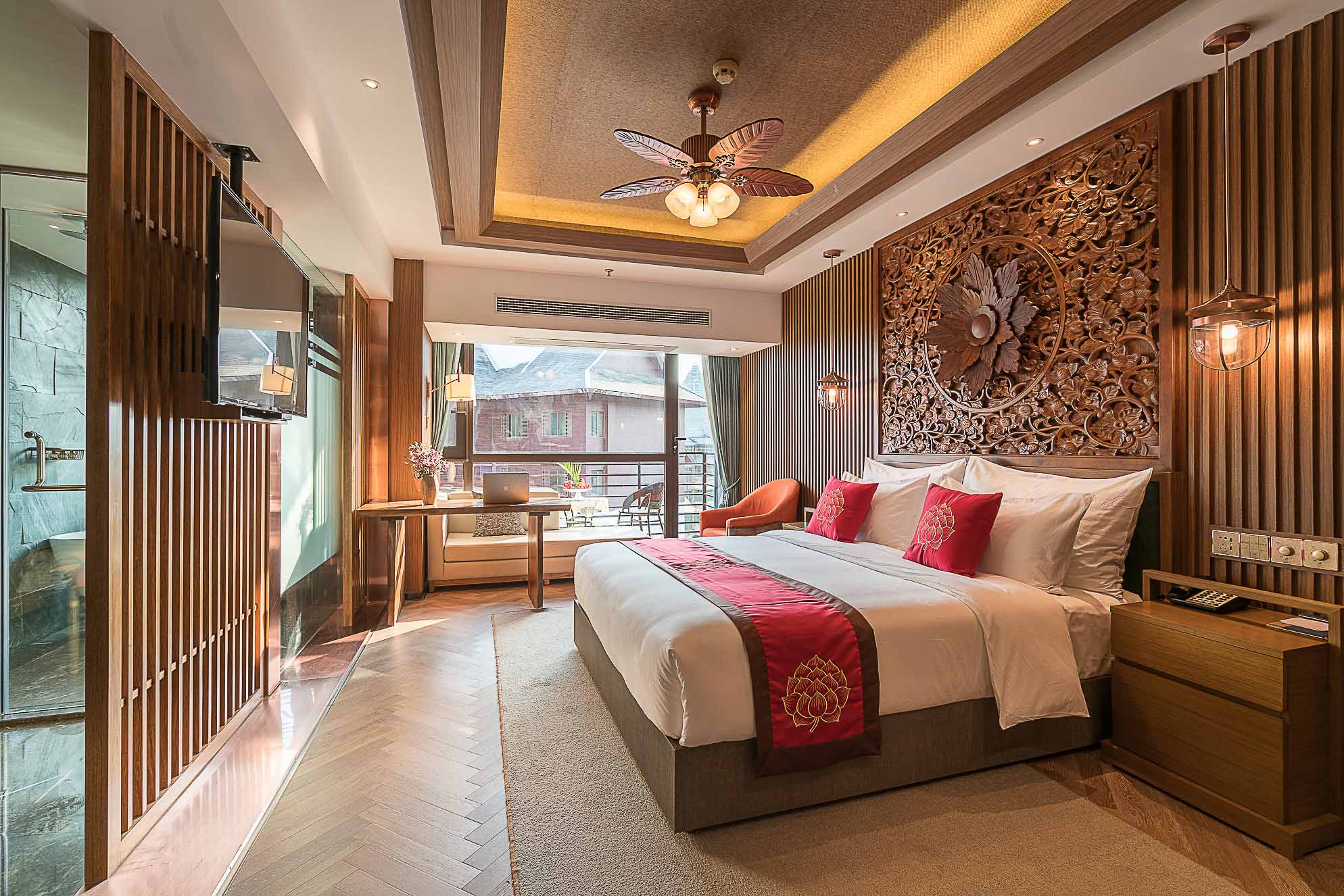 西雙版納泰式主題酒店,保持了泰國本土的風情,建筑不高,給人一種“安靜隱于雨林”的感覺。
