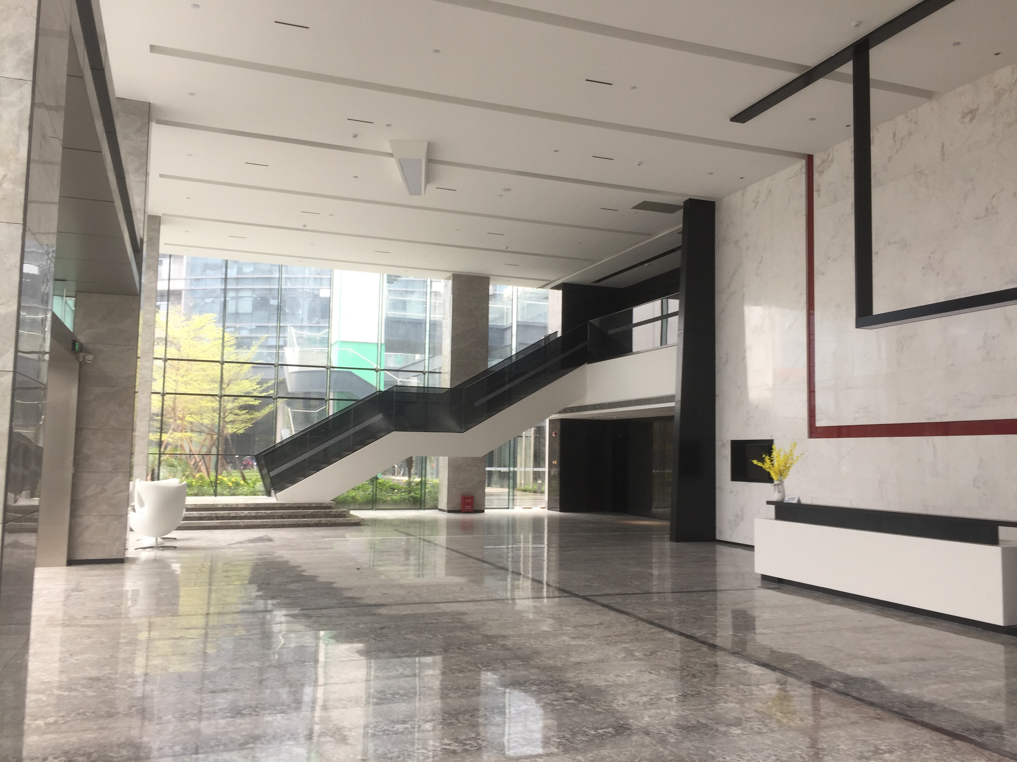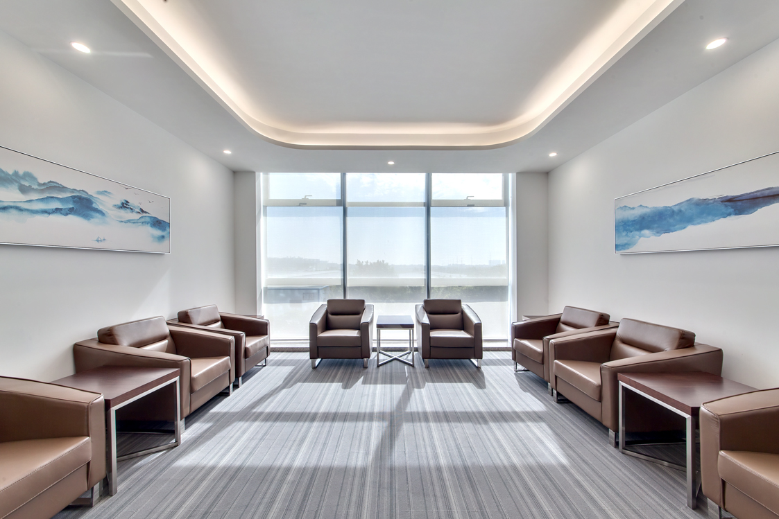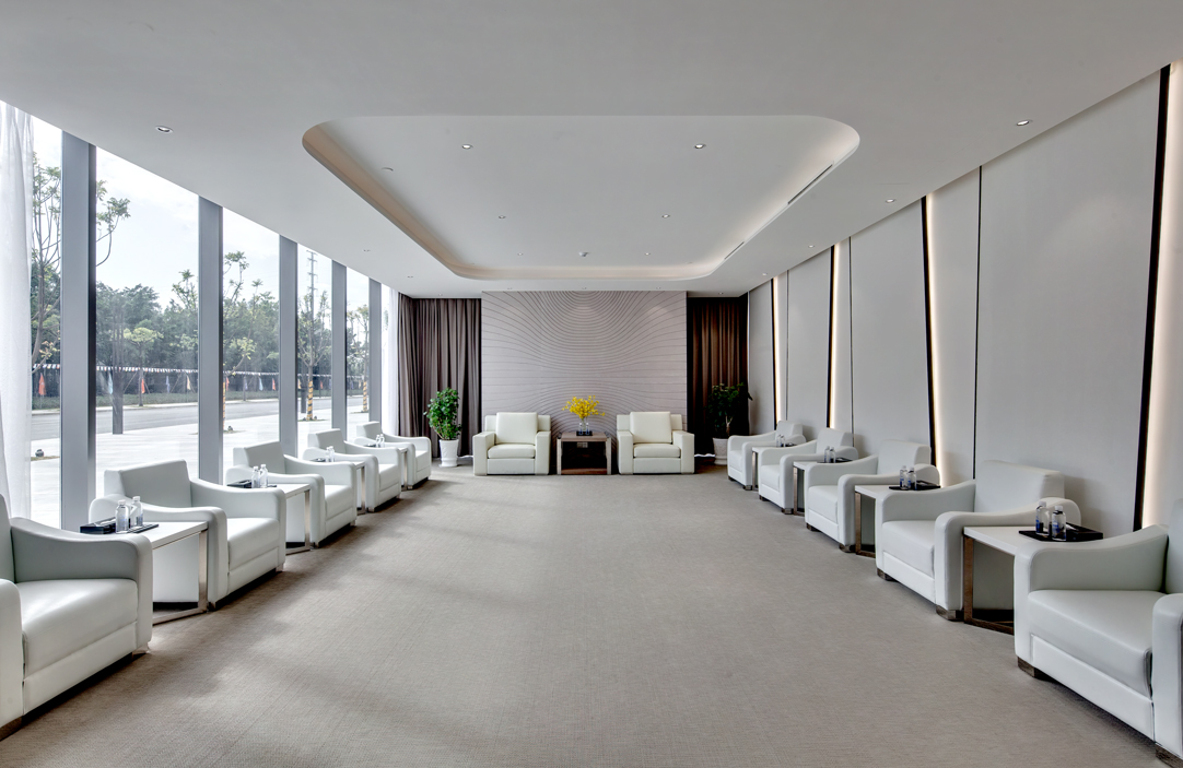 入口辦公前臺區(qū)墻面和前臺運用幾何分割設(shè)計,簡約的材料遇上瘋狂的切割,便會形成獨特的形態(tài),背景墻白色乳膠漆,前臺是白色石材,地面是灰色條紋地毯。同時銷售中心和辦公室墻面以白色乳膠、水泥板、黑色不銹鋼為主,地面木地板,灰色地毯為主,水吧區(qū)域,沙發(fā)用顏色去點綴,在空間節(jié)奏的變化、自然光影的引入和材料肌理的運用,為至銷售中心和辦公室創(chuàng)造豐富和有趣的觀展體驗。
