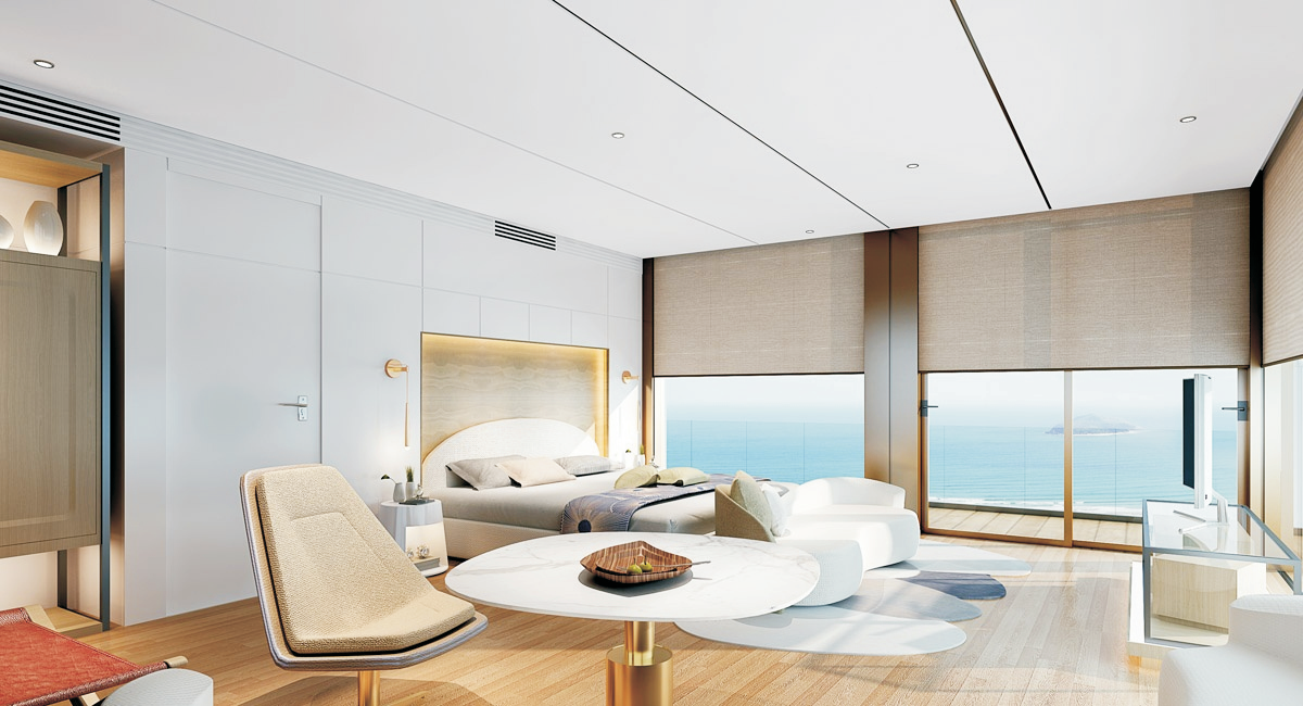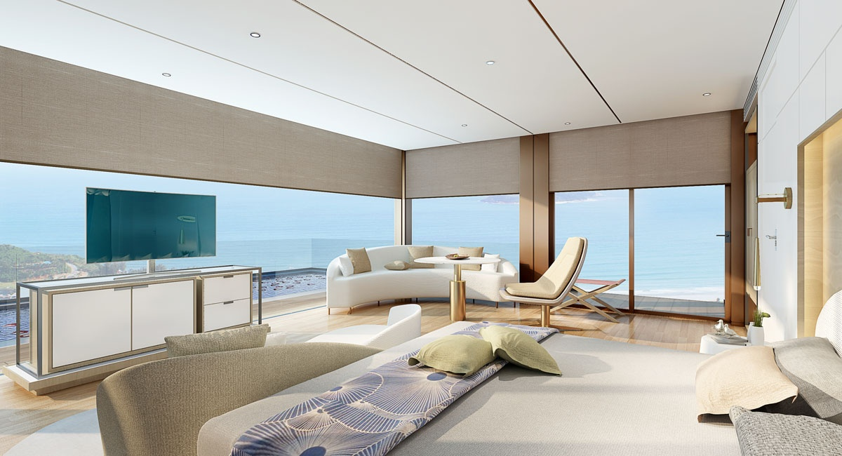 岶勞中集海上酒店項(xiàng)目為集裝箱式獨(dú)立建筑,漂浮在海面上,客房散落在海洋上眾多又美麗,可組合成不同的形狀,美得純粹而原生態(tài),宅在房間里就能欣賞到360一線海景,獨(dú)一無二的眾多海底奇觀。在空間中形態(tài)中,“線”與“形”的元素貫穿場域,流線型幾何塊面的組合貫穿于整個(gè)酒店的設(shè)計(jì)之中,讓酒店像金石一樣歷久彌新,亦象征這酒店百舸爭流、乘風(fēng)破浪、永攀新高的美好寓意。